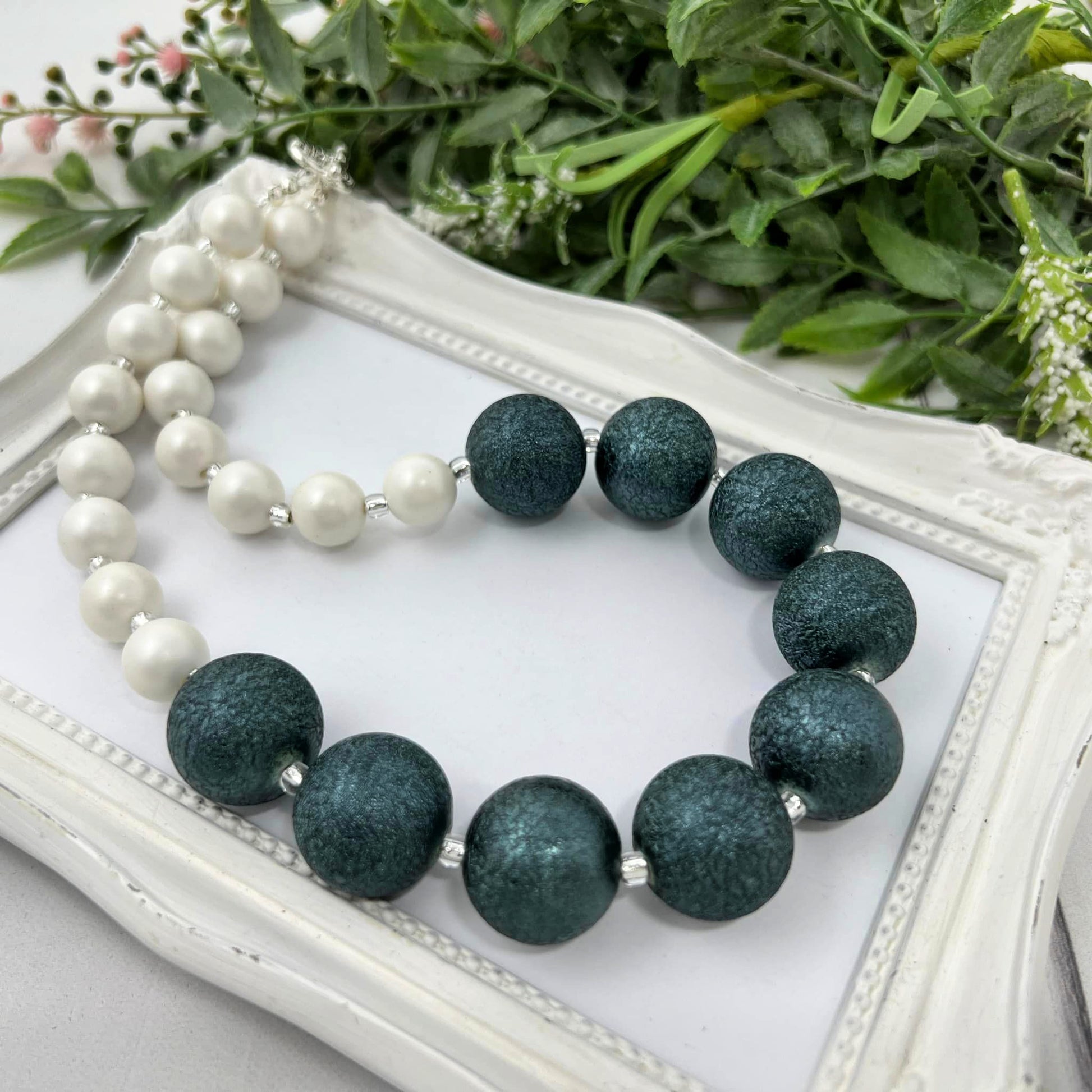 Not-so-chunky necklace with white matte beaded sides. Silver lined crystal spacers & a toggle closure.