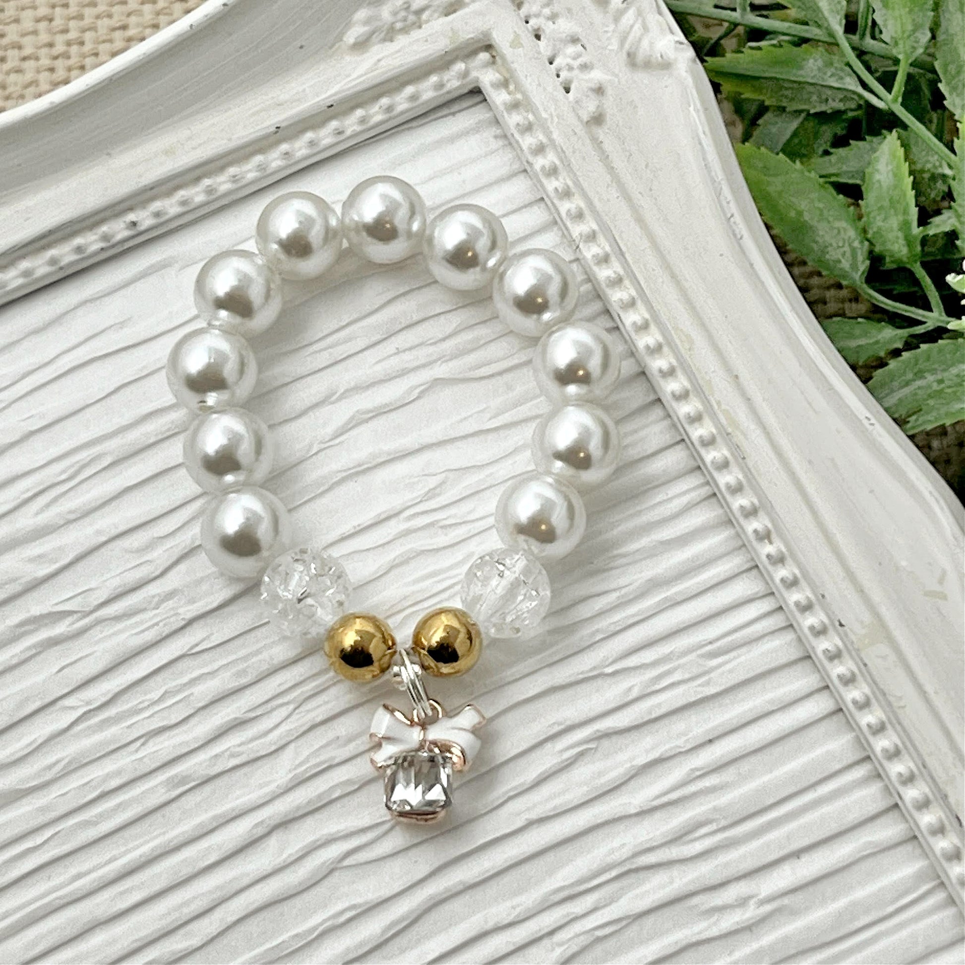 10mm beads and a gift box charm with a white bow, double strung with jewelers elastic.